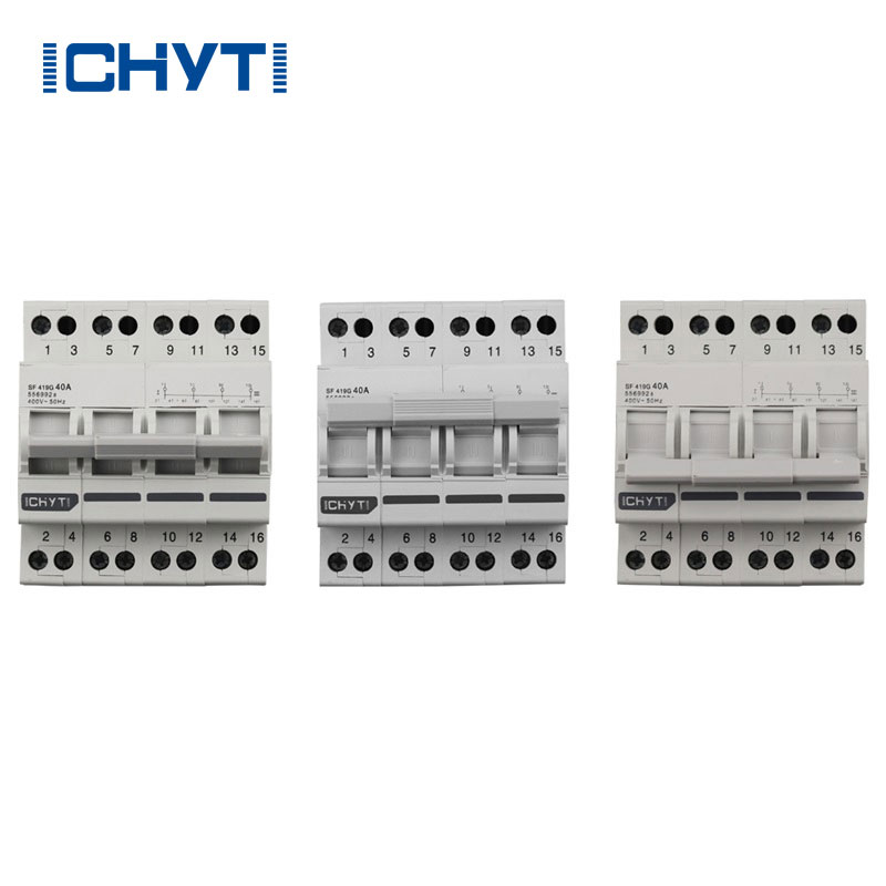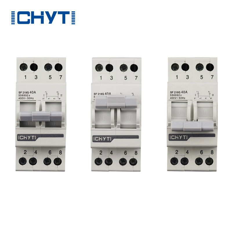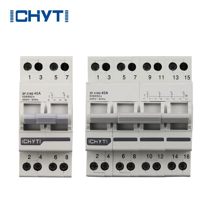 Kína ICHYTI Customized 40 amperes kézi átviteli kapcsoló Free Sample négy funkcióval rendelkezik, nevezetesen kapcsolókonverzióval és leválasztással, és rugalmasan válthat két terhelés között. Beépítése DIN szabványú 35×75-ös sínek segítségével történik, a héj PA66 fröccsöntésből készül, nagy égésgátló teljesítménnyel. Ideális megoldás lehet ipari berendezések, áramkörök be- és kikapcsolására. A 40 amperes kézi váltókapcsoló névleges árama 40A/63A, ami kényelmessé és biztonságossá teszi a vezetősínre történő telepítést és vezetékezést.