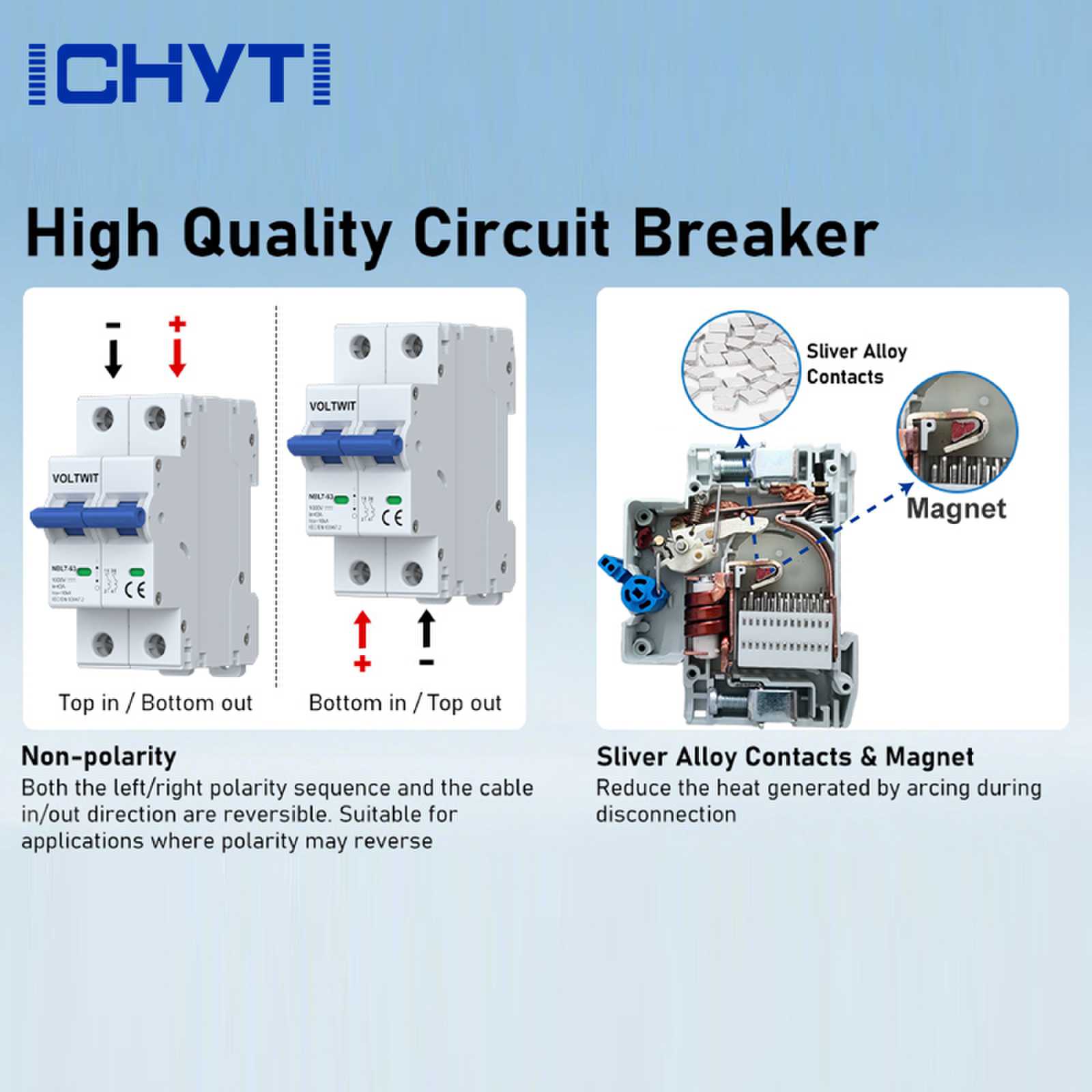 ◉ A CHYT kínai gyártói kiváló minőségű termékeket kínálnak, szívesen vásárolnak jó áron egyenes, kiváló minőségű DC megszakítót. Ez a kínai beszállítók ICHYTI egyenáramú miniatűr megszakítója alkalmas 1000 V alatti névleges egyenáramú áramkörökhöz, főként túlterhelés- és rövidzárlat elleni védelemre, és alkalmankénti üzemváltásra használható. Névleges árama nem haladhatja meg a 63A-t.